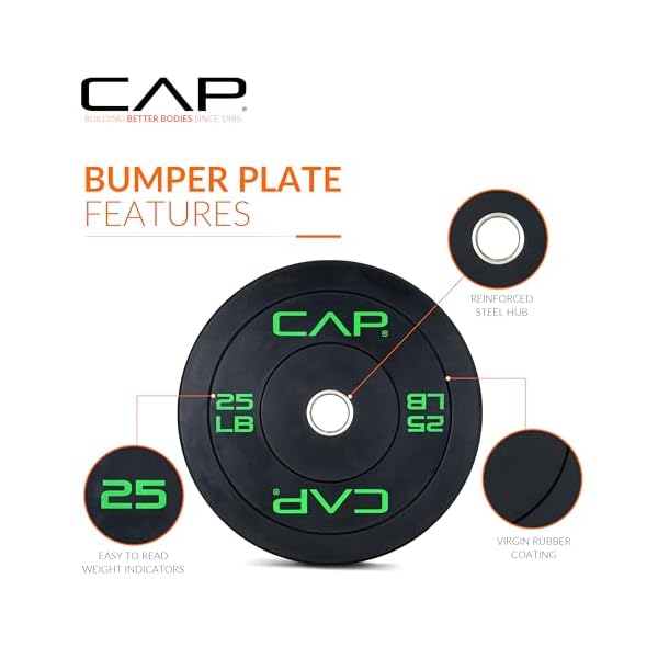 The CAP Barbell PRO Bumper Plate offers protection for both the barbell and the bumper plates with its sound construction. The steel insert hubs reinforce the holes and protect the bar at the same time. This Olympic weight plate set can only be used with Olympic bars (with a 2-inch sleeve diameter). Each weight is made from solid cast iron and coated in virgin and recycled rubber. Adding weights to any fitness routine helps to increase muscle mass while burning more calories and reducing body fat. Add these Olympic bumper plates to your home gym and start experiencing the benefits they can offer to your fitness routine. 30-day manufacturer .