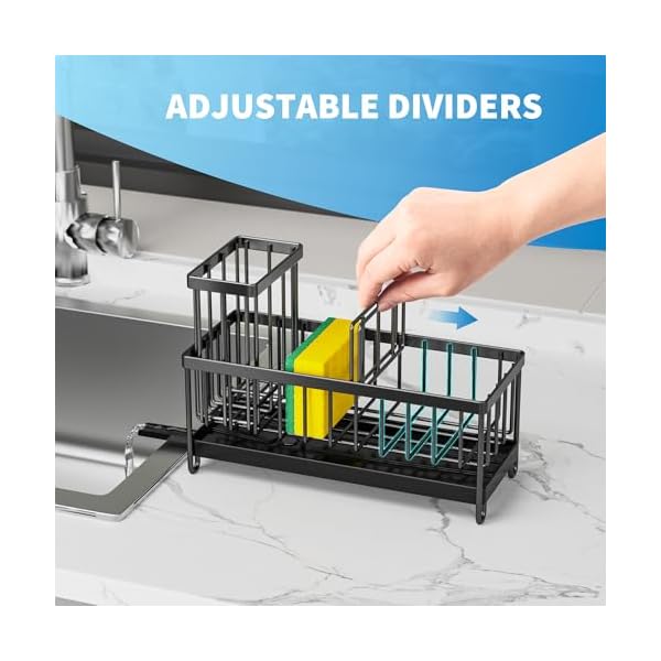【REASONABLE DIVIDER DESIGN】 The sponge holder for kitchen sink ergonomic divider design allows it to have 3 separate storage spaces, Different items are placed in different areas. Make the most of every inch of space and make your kitchen look cleaner.