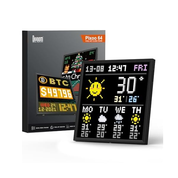 【Meet Pixoo-64】 The Divoom Pixoo-64 is a 10.3 inch WiFi pixel art display Frame with a 64×64 LED panel. You can use the Pixoo as a pixel clock, you also can set up an online information counter and the Pixoo-64 will automatically pull the selected information, such as: streaming channel followers, game KDA results, Twitch streaming information and more.