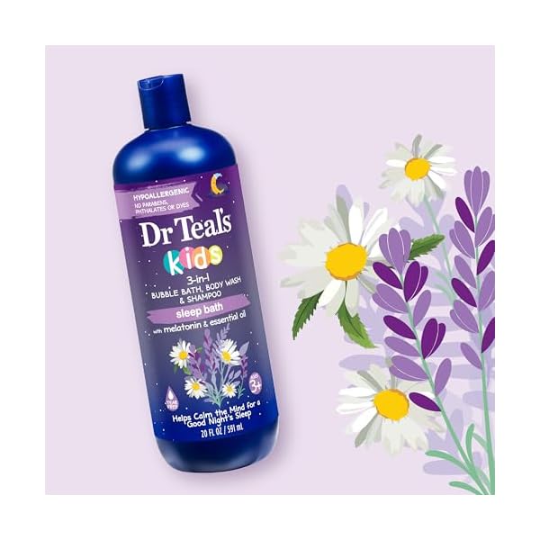 Bath time is fun for kids and easier for parents with Dr Teal’s Kids 3-in-1 Sleep Bath: Bubble Bath, Body Wash & Shampoo with a blend of Melatonin & Essential Oil. Specially formulated to be safe and hypoallergenic, Dr Teal’s Kids 3-in-1 is made with gentle cleansers that make incredible bubbles for a great smelling bubble bath. It also works great as a shampoo and body wash. Melatonin & essential oil help your kids wind down from the day and get ready for bed. Dr Teal’s Kids 3-in-1 Sleep Bath: Bubble Bath, Body Wash & Shampoo with a blend of Melatonin & Essential Oil is paraben-free, phthalate-free, cruelty-free, and vegan.