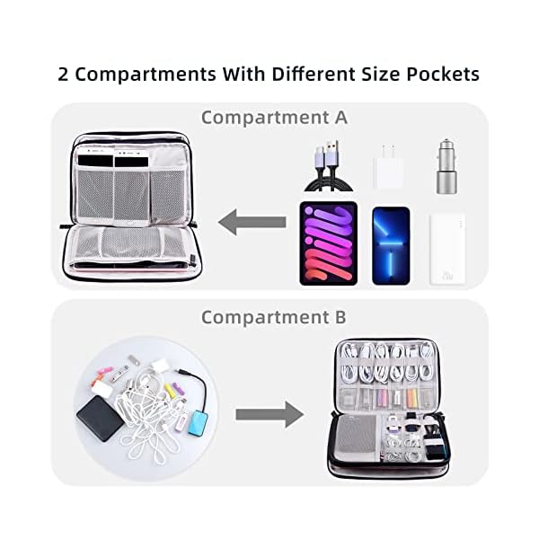 DOUBLE COMPARTMENTS – Charger Organizer features a double-layer design with A compartment holding 1 mesh pocket, 6 small mesh pockets, and 12 elastic bands, and B compartment with 1 large mesh pocket and 2 mesh pockets for organized storage of cables, chargers, and other