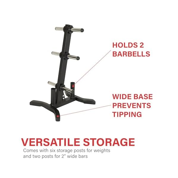 DURABLE AND STABLE: Our tree rack is stable enough to hold 1,000 lb. of weight without tipping over, providing a reliable storage solution for your plates and bars. It has 6 storage posts that measure 2″ x 8 ” each.