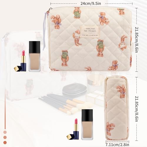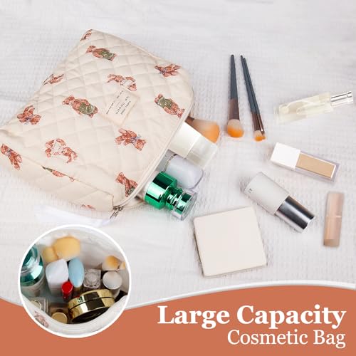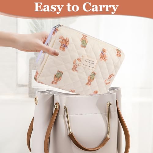 Floral Makeup Bag, Small Cosmetic Bag for Women Girls, Cute Cotton Makeup Bag, Quilted Makeup Bags, Flower Travel Toiletry Organizer Bag (White Bear)