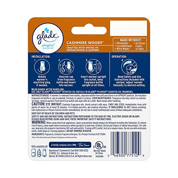 Creating the perfect mood is just an outlet away. With a beautiful design that blends into your home decor, this warmer allows you to use any of your favorite Glade PlugIns Scented Oil refills, including Cashmere Woods. Simply fill the warmer and plug it in to freshen a room with long-lasting scent (up to 50 days on low setting).
