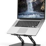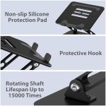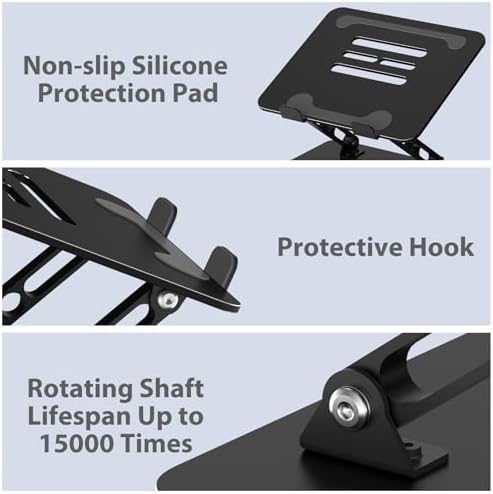 About this item 【Adjustable & Ergonomic】:This laptop stand can be adjusted to a comfortable height and angle according to your actual needs, letting you fix posture and reduce your neck fatigue, back pain and eye strain. Very comfortable for working in home, office and outdoor. 【Sturdy & Protective】 :Made of sturdy metal, it can support up to 17.6 lbs (8kg) weight on top; With 2 rubber mats on the hook and anti-skid silicone pads on top & bottom, it can secure your laptop in place and maximum protect your device from scratches and sliding. Moreover, smooth edges will never hurt your hands. 【Heat Dissipation】 :The top of the laptop stand is designed with multiple ventilation holes. The open design offers greater ventilation and more airflow to cool your laptop during operation other than it just lays flat on the table. 【Portable & Foldable】:The foldable design allows you to easily slip it in your backpack. Ideal for people who travel for business a lot. 【Broad Compatibility】:Our desktop book stand is compatible with all laptops from 10-15.6 inches, such as MacBook Air/ Pro, Google Pixelbook, Dell XPS, HP, ASUS, Lenovo ThinkPad, Acer, Chromebook and Microsoft Surface, etc.Be your ideal companion in Home, Office & Outdoor.