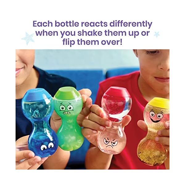 EMOTIONAL REGULATION FOR KIDS: Each engaging bottle is uniquely designed with its own facial expression, color, and interactive element that embodies a different feeling. The contents of each bottle represent the feeling shown on its face.