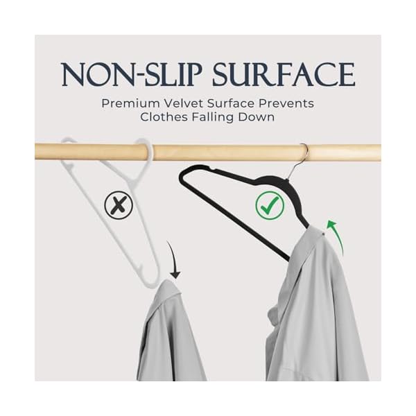 Stylish Finish: Soft and luxurious velvet, unlike plastic or metal hangers; The finest velvet material for all our velvet hangers help to keep the fuzz from shedding off and stain your clothing; Prevents clothes from slip-off the velvet flocked hangers
