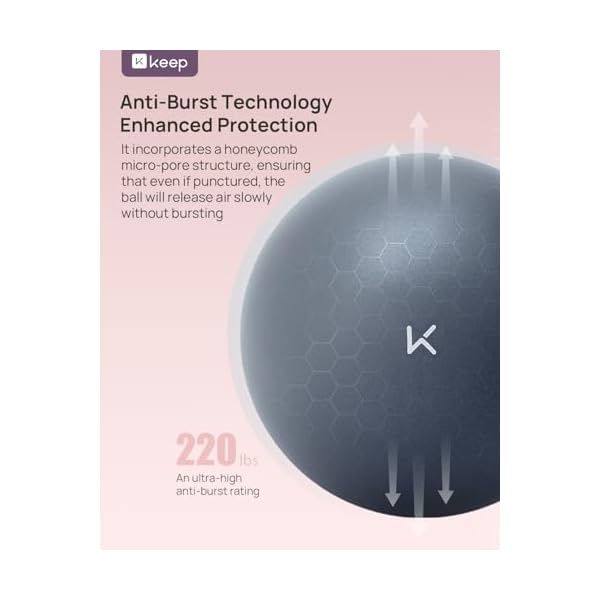 Anti-Bust & Worry-Free — The KEEP Fitness Ball features anti-burst technology with a honeycomb microporous foaming structure. It has passed strict explosion-proof test, with an ultra-high anti-burst rating of 1300 lbs. In the event of puncture by sharp objects, the ball deflates slowly rather than bursting, ensuring your safety is always protected