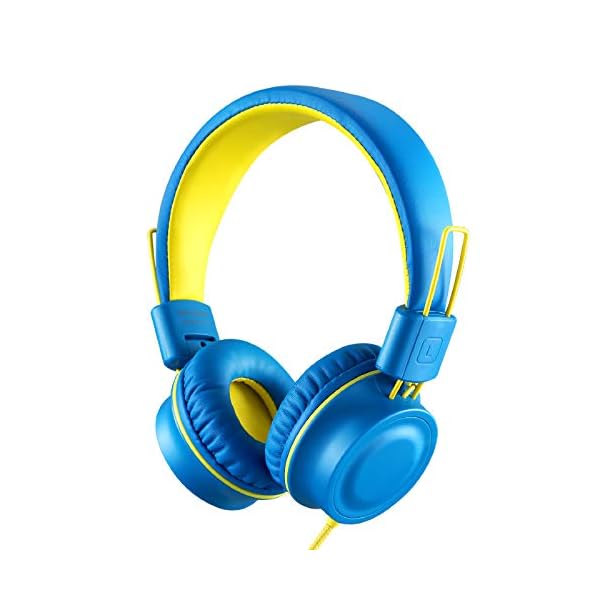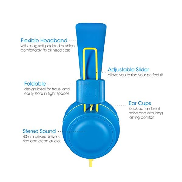 Designed for kids ages 3 to 16, little or older kids, girls, boys, children, toddlers, home/online school, training, long airplane or car rides. On-ear wired headphones have padded soft cushions with a semi-gloss finish for a comfortable fit. The headband is adjustable and flexible to fit most head sizes. The headphones can also be folded in, making it small and compact for easy storage. The cord is a 5 feet long durable nylon braided cable that prevents tangling.