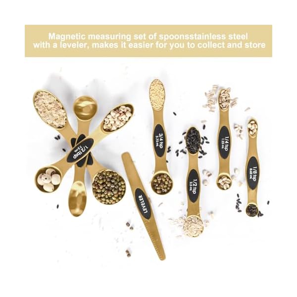 Accurate Measuring Spoons Set:Designed stainless steel double-headed spoons set and a leveler,black plastic label on the magnetic measuring spoons set stainless steel with clear usa standard measurement markings is useful for you to cook pastry food more accurately.This tables gadgets new apartment essentials spoons set is available in various sizes, includes 1/16 tsp, 1/8 tsp, 1/4 tsp, 1/2 tsp, 3/4 tsp, 1 tsp, 1/2 Tbsp, 1 Tbsp plus and 1 leveler.