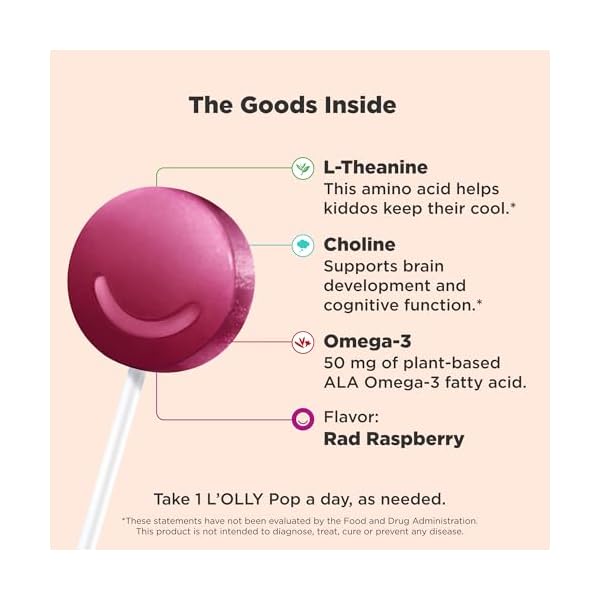 Start feeling cool, calm and collected. Treat your kids to the OLLY Mellow Buddies, a supplement that supports healthy brain function and relaxation. That’s our kind of peace of mind.* These lovable OLLY kids lollipops contain a brainy blend of science-backed ingredients to help kiddos stay calm (but not drowsy). L-Theanine is an amino acid that works within 60 minutes to support relaxation and help reduce occasional mental stress. Choline is a powerhouse ingredient that helps support brain development and normal cognitive function.* Say hello-mega to 50 mg of plant-based ALA Omega-3 fatty acid. These delicious lollipops come in handy when it’s time to settle down on long car rides or stay cool and collected during exams* Kids 4 and up, take 1 lollipop per day as needed. These tasty lollipops are bursting with red raspberry flavors and other natural flavors. L’OLLY Brainy Pops are happily gluten free, vegetarian, certified vegan and formulated with naturally-sourced sweeteners and no synthetic flavors or colors. †Circana, MULOC+, Total Kid’s VMS, 52 Weeks Ending 01/26/25 *These statements have not been evaluated by the Food and Drug Administration. This product is not intended to diagnose, treat, cure or prevent any disease.