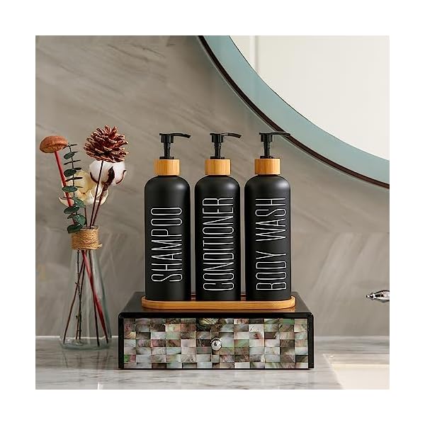 [Exceptional Quality] The shampoo dispenser bottles are made of high-quality thick plastic which is matched with bamboo pumps. Empty shampoo and conditioner bottles are rust-free and reliable and can be refilled for multiple uses.