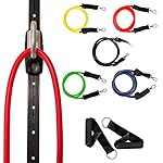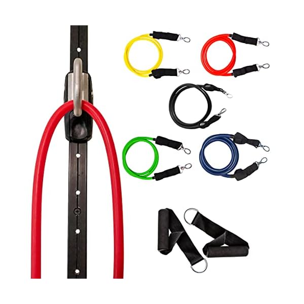 What’s Included? 1 – Nylon and Fiberlass Reinforced Stainless Steel Hook/Railcar, 1 – Set of 10 Screws (#8, 2 inch, course thread, sharp point), 1 – Mounting Bracket (3 foot section of heavy aluminum), 2 – Rubber Washers, 5 Long Resistance Bands, 1 Set of Handles