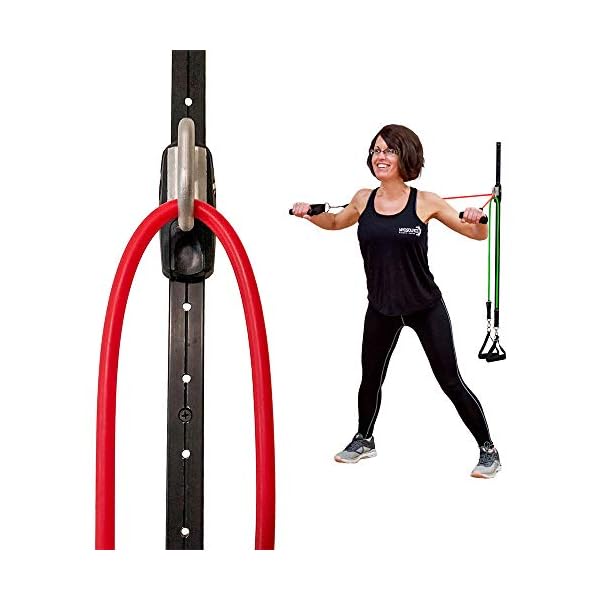 The Space Saver Gym (cable workout wall mount or resistance band wall mount system) by Dunn Concepts LLC is a sturdy and functional piece of exercise equipment for home or the office. It can accommodate most elastic tubing resistance bands women including heavy resistance bands metal clip, body bands, or suspension straps. This resistance band wall mounts should be secured to a wall stud with the supplied wood screws or it can be fastened to a masonry wall with appropriate anchors (not supplied). Great alternative to shoulder pulley for physical therapy over the door. The Space Saver Gym (wall anchor for resistance bands or resistance band wall anchors) by Dunn Concepts LLC is the perfect addition to any home ligas para hacer ejercicio, office, or gym to help maximize resistance training workouts without taking up a lot of space. The Space Saver Gym is easy to put together and attach to the studs in a clean flat wall and just as easy to use for a full body workout. Our resistance bands wall anchor is designed to use with resistance bands that attach to an adjustable rail car that can be moved to any height for any user or workout desired. The easy resistance band attachment and detachment makes it simple to change the level of resistance you want to incorporate into your workout whether it be for lighter toning or muscle building. This unique piece of strength training equipment accommodates most elastic tubing workout bands resistance and allows you to perform hundreds of workouts. When mounted vertically, this at home gym provides 16 different levels. Easily slide the rail car in 2 inch increments to adjust the height with the touch of a button. Each car is designed for a single elastic tubing resistant bands for exercise bands mount. Includes: 1 3-foot sturdy aluminum mounting brackets, 1 sliding rail car, 10 – 2-inch screws. The adjustable stainless steel rail car is reinforced with nylon and fiberglass for extreme durability.