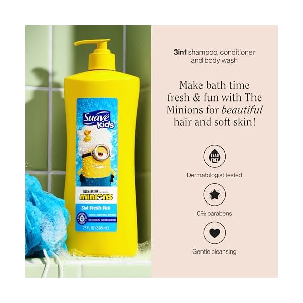 Make bath time a blast time with Suave Kids Minions 3-in-1 Shampoo, Conditioner & Body Wash. This all-in-one playful powerhouse simplifies your child’s bathing routine by combining a gentle shampoo, nourishing conditioner, and refreshing body wash into one fun product. The delightful Minions theme adds a mischievous touch that kids will love, transforming a chore into a little adventure. Formulated with a dermatologist-tested, tear-free formula, this body wash ensures that your little ones can wash up without any tears or discomfort. Plus, with 0% parabens, you can trust that you’re giving your child a safe and gentle product designed specifically for their delicate skin. Suave Kids Minions 3-in-1 effectively cleanses while moisturizing hair and skin, leaving them soft, smooth, and manageable. Just wet, lather, and rinse for an effortless and enjoyable clean. Let your kids love a bath time experience filled with fun and freshness, making every moment spent bathing a joyful moment!