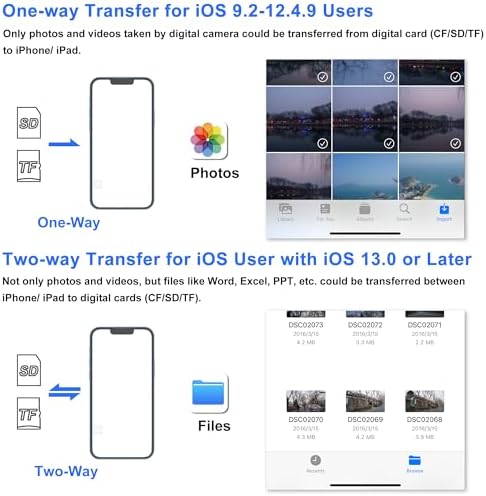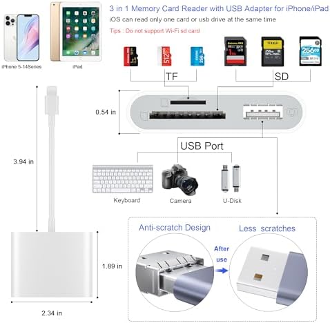 About this item [Tool for photographer]: It is a Photography Accessories for Canon Nikon SLR Digital Camera. No App to be downloaded. 5 seconds after inserting the memory card and connecting with the iPhone, click ‘Photos’ APP and find ‘Import’, then import video and photos from memory card to your iPhone or iPad. [Accessories for iPhone with Dual Card Slots]: This SZHAIYIJIN Memory Card Reader for iPhone Support SD Card and TF Card, Secure Digital (Standard SD/SDHC) and Micro SD(TF) card. Do NOT Support Wi-Fi SD Memory card. [The Female USB Interface]: Lightning to USB adapter has the Female USB Interface is a OTG Camera Adapter for iPhone &iPad, supports Digital camera, SLR Camera, The USB camera adapter does not require an application, and there is no need to remove the camera’s memory card. You Can also plug the USB Flash Drive, Card reader, USB Headphone, Electric Guitar, MIDI keyboard, etc. (The maximum current of the peripherals does not exceed 500 mA). Not Support the Printer and Hard disk drive. [Two-way Transfer]: Two-way transfer suitable for iOS 13 -16 device. Import data from SD/TF card to iPhone/iPad, or export the file from iPhone/iPad to SD/TF card. Include Movies, Music, Word, Power point, Excel, PDF, etc. [High Speed Data Transfer]: Support fast transfers standard photo formats, including JPEG, RAW, along with SD and HD video formats, including H.264 and MPEG-4. Easily and quickly transfer photos/videos to device and share images/videos of your camera to social media anywhere. [Universal Compatibility]:The iPhone SD card reader Designed for iPhone between 5 to 14, Not for iPhone 15&16. It Compatible with iPhone 14/14 Plus/14 Pro/14 Pro Max/13/13 mini /13 Pro/ 13 Pro Max / 12/12 mini/12 Pro/12 Pro Max /11/11 Pro/XS/XS Max/XR/ X/8/8 Plus / 7/7 Plus / 6s / 6s Plus / 6/6 Plus / SE /SE2 and iPad Air / Mini / Pro with Lightning Port etc.
